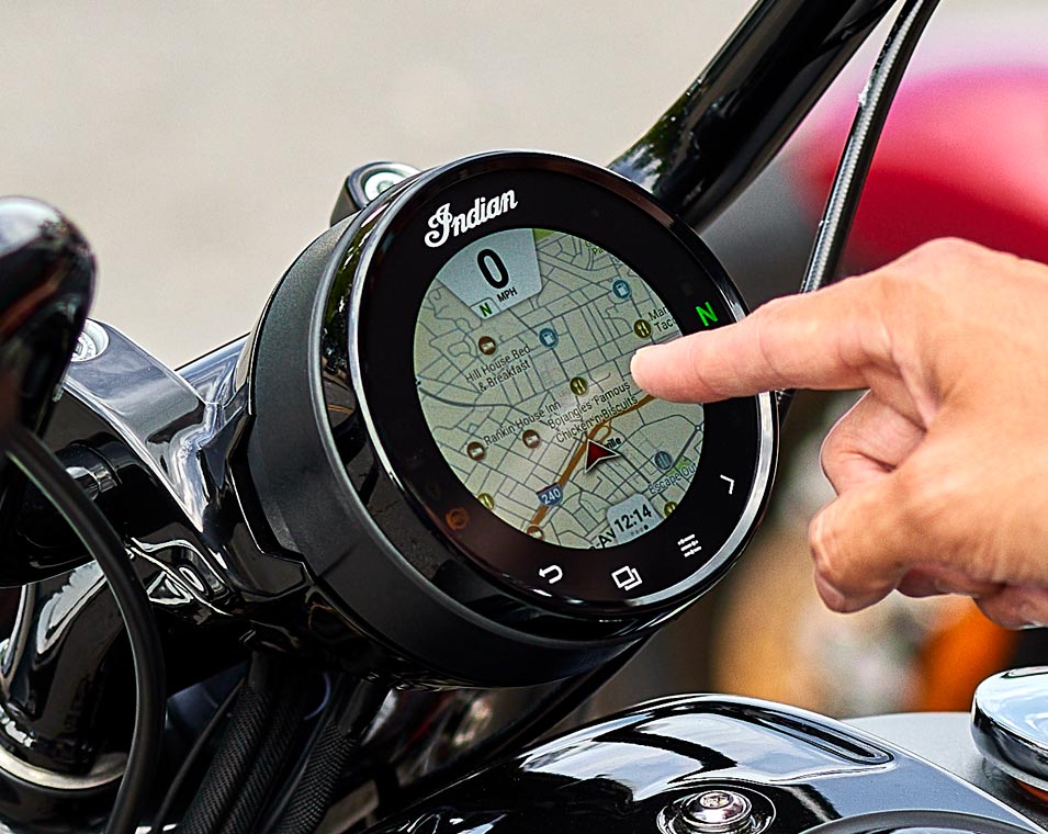 | Info entretenimiento | Pantalla táctil de 4" gestionada por RIDE COMMAND: La pantalla táctil incluye reloj horario; temperatura ambiente; rumbo; visualización de información de audio; mapa/navegación; estado del Bluetooth para el teléfono y los auriculares; estado del vehículo (voltaje, horas del motor, cambio de aceite); información del vehículo (velocidad, autonomía, RPM, posición del cambio ); datos actuales del viaje (distancia, tiempo de desplazamiento, tiempo de parada, altitud, cambio de altitud); cuentakilómetros parciales; selección del modo de conducción; brillo de la pantalla y lectura del código de problemas del vehículo. |